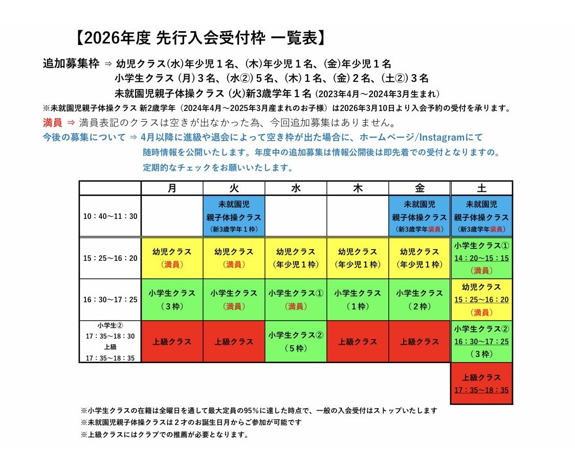幼児クラス(火)、幼児クラス(水)の追加募集枠は満員となりました。